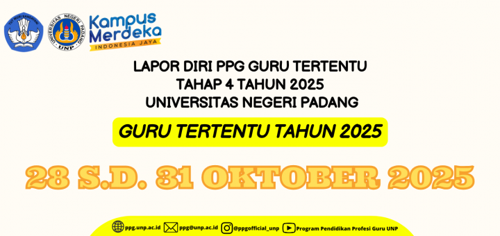 Berdasarkan surat dari Direktorat Jenderal Guru Tenaga Kependidikan, dan Pendidikan Guru Kementerian Pendidikan Dasar dan Menengah Nomor 1371/B2/GT.00.08/2025 tentang Pelaksanaan PPG bagi Guru Tertentu Tahap 4 tahun 2025 (klik disini untuk melihat surat) dengan ini Program Studi Pendidikan Profesi Guru (PPG) Sekolah Pascasarjana Universitas Negeri Padang (UNP) menginformasikan bahwa bagi yang belum melakukan konfirmasi kesediaan silahkan lakukan konfrimasi kesediaan dengan panduan berikut klik disini untuk panduan konfrimasi kesediaan dan lapor diri akan dilakukan sesuai dengan jadwal yang diberikan yaitu tanggal 28 s.d. 31 Oktober 2025.